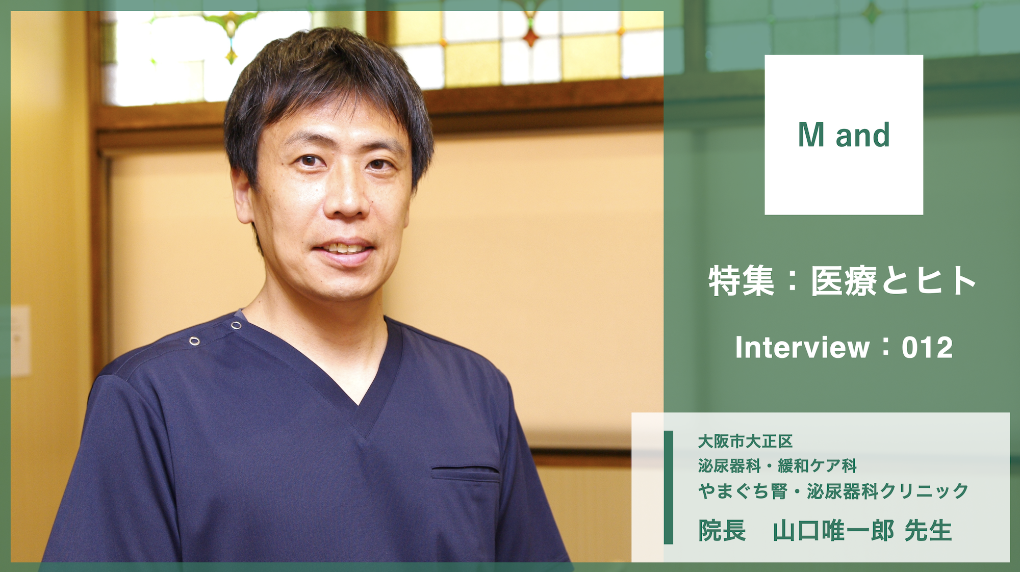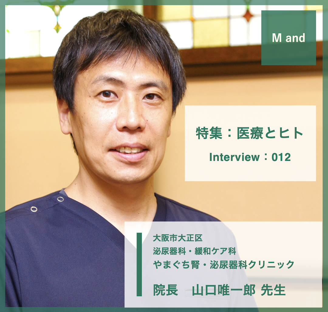 医療カルチャー発信メディア「エムアンド」では、泌尿器科に関する身近で些細な症状から、緩和ケアが必要な終末期医療に至るまで、泌尿器科疾患を知り尽くした院長の山口唯一郎先生を取材。泌尿器科疾患に関する話題はもちろんのこと、緩和ケアの有資格者でもある山口先生が、クリニックでの外来のみならず、大阪市内西部エリアでの訪問診療を実践する理由など、詳しく話を聞いた。